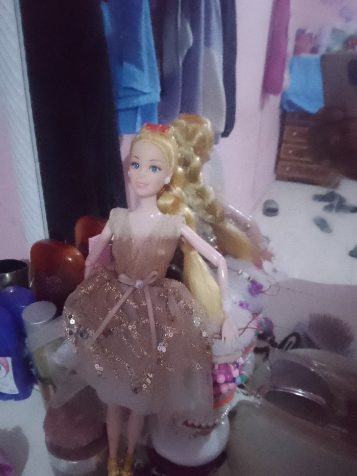 A blonde Barbie doll with blue eyes and a red bow in her hair stands in front of a mirror. She wears a nude dress with a sequined tulle overlay. Another Barbie doll with blonde braided hair stands behind her, partially obscured. The dolls are surrounded by various objects, including makeup containers and cosmetic accessories, on a shelf in a bedroom setting. Clothes hang in the background near a pink wall.