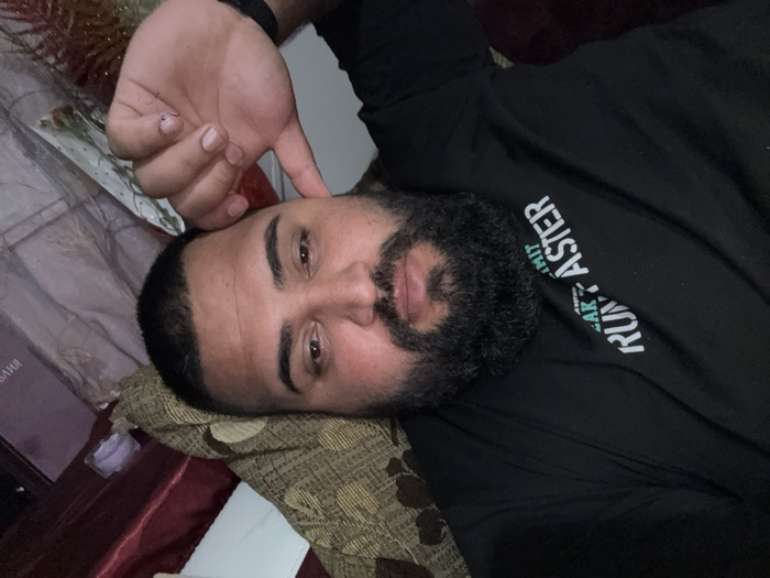 A male individual with dark, short hair and a full beard and mustache is depicted in an indoor setting within the city of Kameno, Bulgaria. He is positioned reclining, with his head resting on a patterned brown and gold cushion. The individual is wearing a black long-sleeved shirt featuring white and teal text on the chest, which partially reads "RUN ASHTER" (likely "RUN FASTER") and "LIMIT BREAK." His right hand is raised above his head, with fingers partially extended, revealing a black wristband on his wrist. His gaze is directed towards the camera. The background consists of a dark red fabric surface, possibly a tablecloth, on which a small, clear container with purple contents is visible. To the left, a reddish-gold glittery decorative object is present, along with partially visible Cyrillic text on a darker surface, reading "ЛИЯ." A piece of white paper or material is also on the red surface.