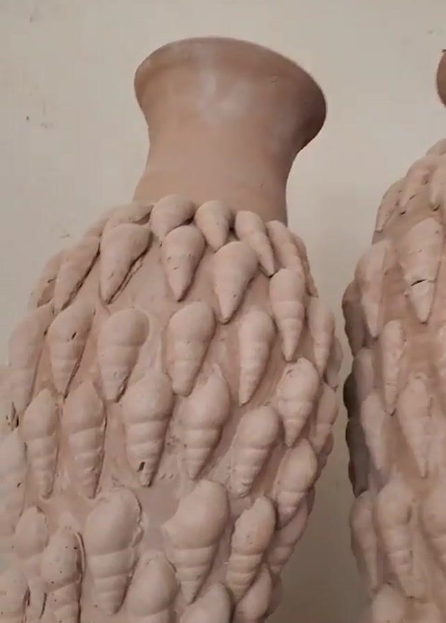 The camera pans out, showing two unglazed, undecorated clay pots of similar shape and design resting on a shelf. The pots are beige and decorated with what appears to be numerous small, similarly-shaped clay shapes. To the side of the pots are several other ceramic art objects, including a yellow vase and what appears to be a rock. The pots are placed against a white wall and the shelf is numbered.