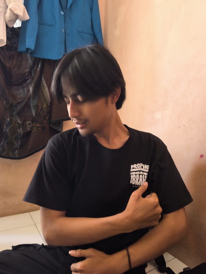 A young adult male, appearing of Southeast Asian descent, is seated and depicted from the waist up in an indoor setting. He has short black hair with a center part and light facial stubble. He is wearing a black short-sleeved t-shirt with white text on the left chest that partially reads "PROPHET IBRAHIM," black trousers, and a dark beaded bracelet on his right wrist. His gaze is directed downwards and to his left. His left hand is gripping his right bicep, while his right hand rests on his left thigh. The background features a light peach-colored wall with three garments hanging: a white garment, a blue long-sleeved garment, and a dark brown patterned fabric. A light-colored tiled floor is visible at the bottom left. The scene is located in Muka, Indonesia.