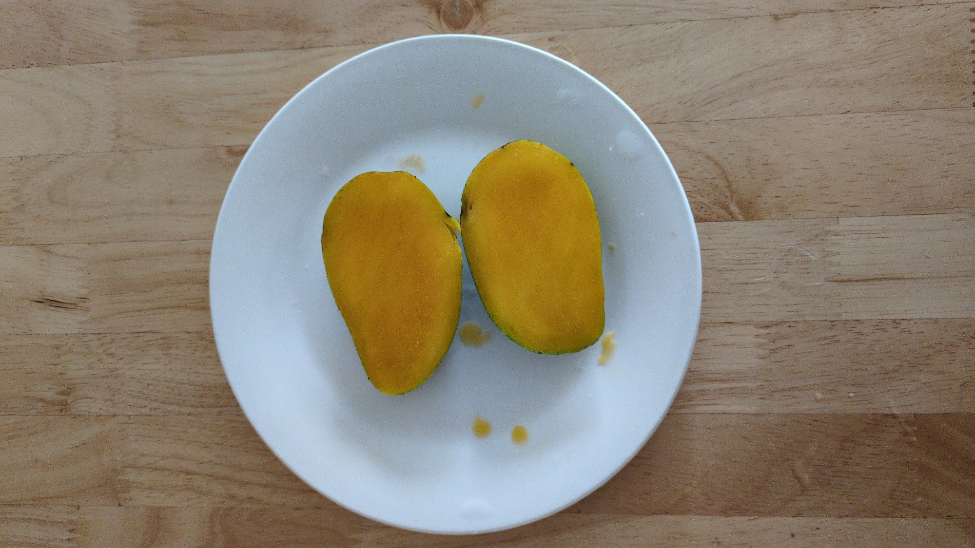A white plate sits on a light brown wooden surface. On the plate are two mango halves. Some droplets of liquid are also on the plate. The image's location is suspected to be in Quy Nhon Ward, Vietnam.
