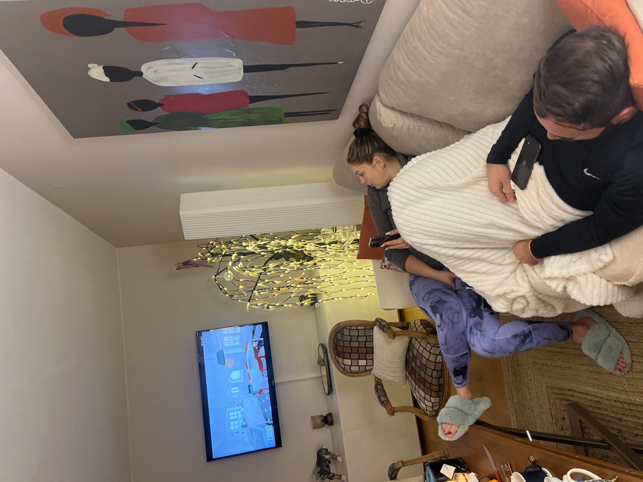 A man and woman relax on a couch, wrapped in a white blanket. The man is wearing a black long-sleeved shirt and the woman is in a gray top and purple patterned leggings. Both are looking at their phones. A painting hangs on the wall above the couch, and a television displays a video. The room has a cozy ambiance with fairy lights and a wicker chair.