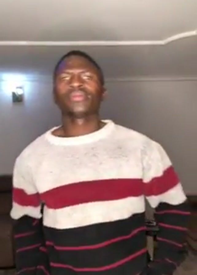 A medium shot shows a dark-skinned man in a room with white walls, wearing a white, burgundy, and black striped sweater