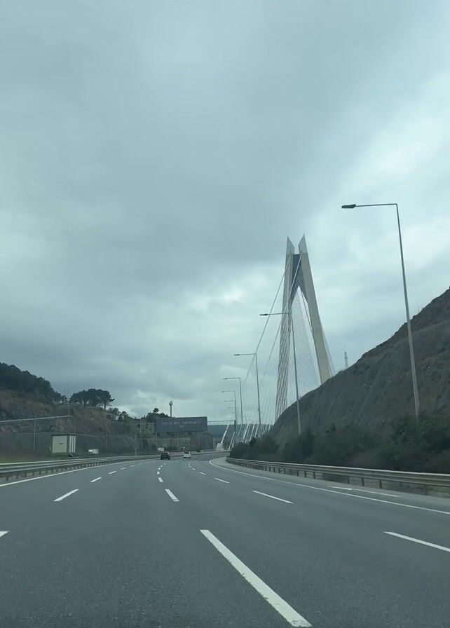 car driving towards a large cable-stayed bridge on a cloudy day