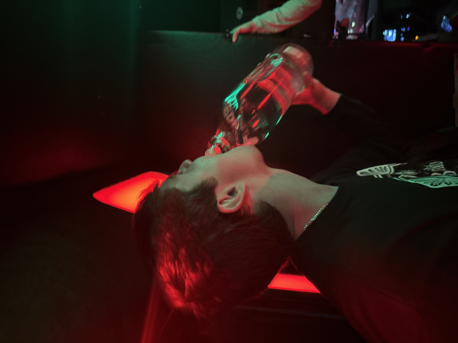 A person lying on their back drinks directly from a large, clear bottle in a dimly lit space. Red and green lights illuminate the scene, reflecting off the bottle and the person's face and hair. Another person's arm is visible in the background, reaching toward a dark surface. The person drinking wears a black shirt with a white graphic and a silver chain. A red light shines directly beneath the person.