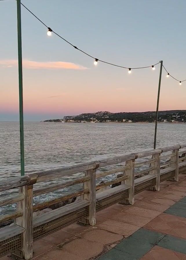 view from a dock or pier at dusk. The sky is a soft gradient of blue and pink, reflected in the rippling water. A string of lights hangs above, illuminating the scene. To the right, a weathered wooden railing borders a tiled walkway. In the distance, a stretch of land is visible along the horizon.