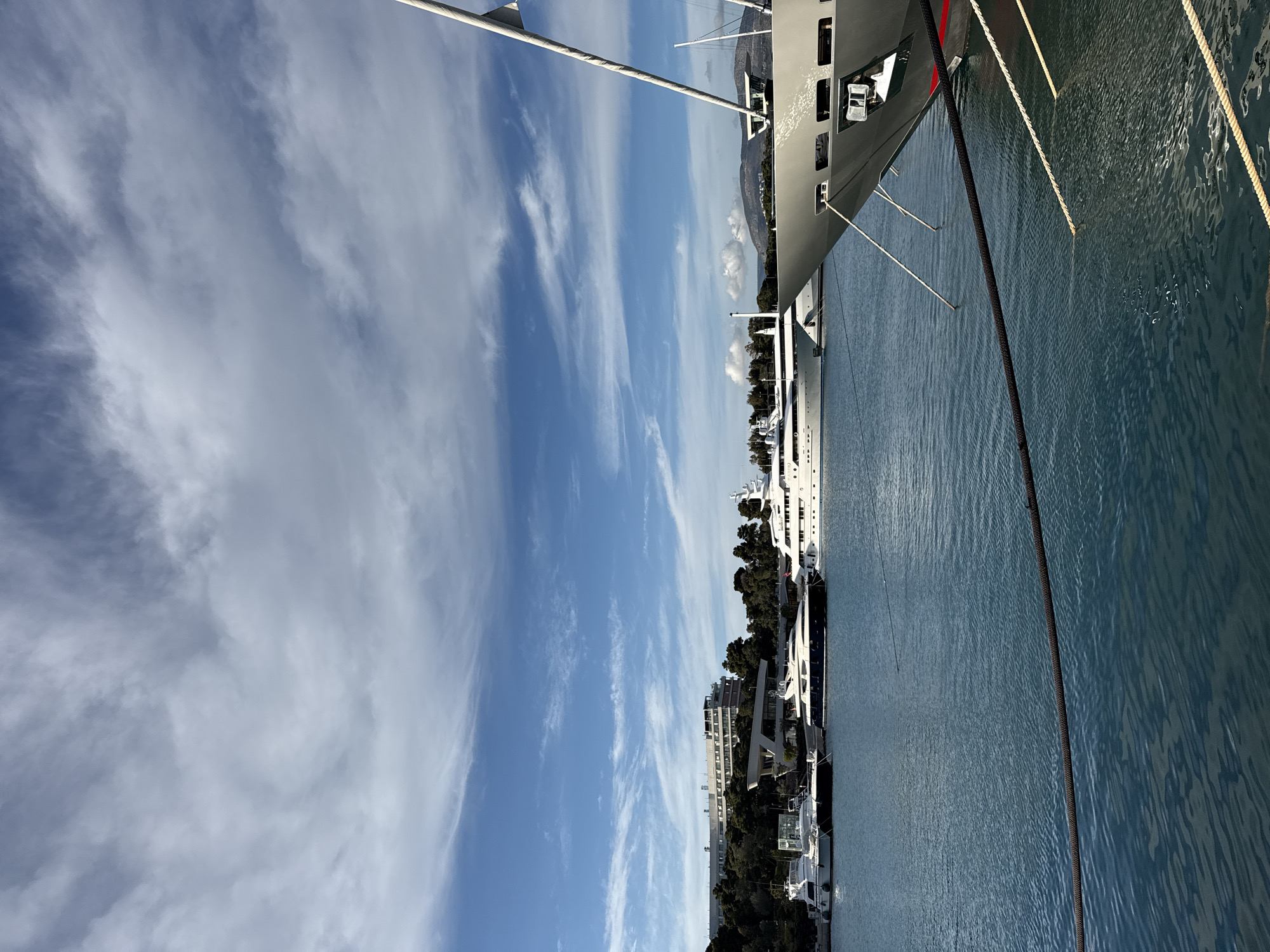 marina in Vouliagmeni, Greece, with yachts docked. The sky is blue with streaky clouds. Buildings and trees line the shore. The water is calm. Dock lines are visible along the edge of the yachts.