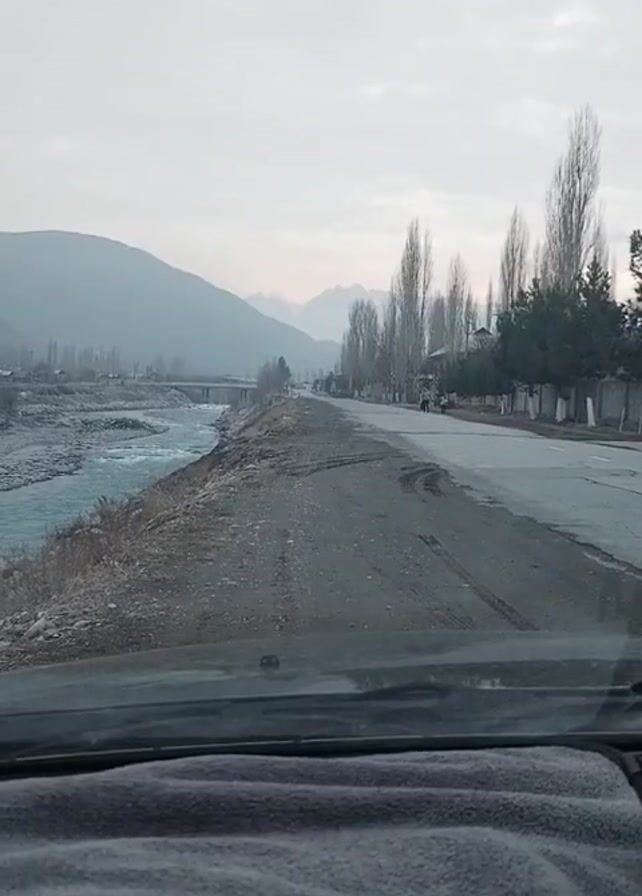 view from inside a car driving along a road next to a river. The road is paved and stretches into the distance, bordered by trees on one side and the river on the other. A bridge crosses the river further down the road. Mountains are visible in the background, shrouded in mist or fog. The sky is overcast. The car's dashboard is visible in the foreground, covered with a grey cloth. The scene appears calm and quiet.