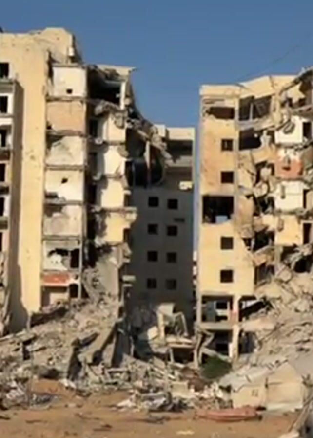 remains of a destroyed neighborhood. The scene features several high-rise buildings that have been severely damaged, with some partially collapsed. The ground is covered in debris and rubble. A blue sky is visible in the background. A tent and some basic furniture can be seen amidst the destruction, suggesting people may be living in the area. There is some talking in the video, but it is in a foreign language.