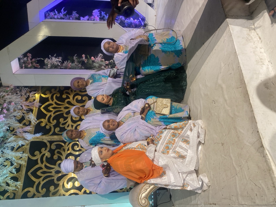 A group of women, dressed in traditional attire, are seated for a photo. Some wear head coverings, while others have their hair styled. They are wearing colorful and patterned outfits. Behind them, there's a decorated backdrop with floral arrangements and ornate designs. A hand holding a camera is visible at the top of the frame. The scene appears to be part of a festive event, possibly a wedding or a celebration.