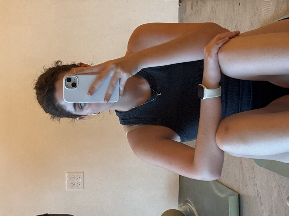A female subject is seated on a light-colored floor, possibly a gym or studio setting. She wears a dark gray ribbed tank top, with a light-colored bra strap visible, and dark shorts. A light-colored smartwatch is present on her left wrist, and a silver-colored necklace with a small 'L' pendant hangs around her neck. A small hoop earring is visible in her left ear. The subject's face is largely obscured by a light-colored smartphone, likely an iPhone with dual camera lenses, held in her right hand, positioned as if taking a selfie. The background consists of a plain, light tan wall. A white electrical outlet featuring two duplex receptacles (four outlets total) is mounted on the wall to the subject's left. On the floor to the far left, a green or dark gray mat is partially visible, along with a blurred, light-colored spherical object and another flat, dark gray object. The scene is indoors. No specific visual cues definitively identify the exact location within the city of Houston, United States, though the electrical outlets are consistent with North American standards.