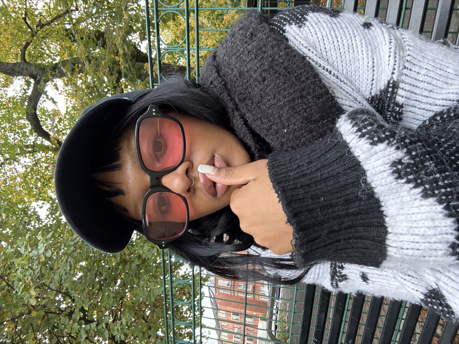 A person with dark skin and dark hair with bangs, wearing a black baseball cap and large black-framed glasses with red-tinted lenses, is positioned in a medium shot. A septum piercing is visible. The individual is wearing a black and white patterned knitted sweater and a dark, textured scarf or cowl neck. The person's right hand is raised, with the index finger touching the lower lip; fingernails are painted white. The individual is seated on a black slatted bench. Behind the bench is a green metal fence. In the background, deciduous trees with green and yellowish leaves are visible. Further in the background, to the left, are red sandstone tenement buildings, characteristic of residential architecture in Glasgow, United Kingdom. The scene depicts an outdoor public space, likely a park or square, under an overcast sky.