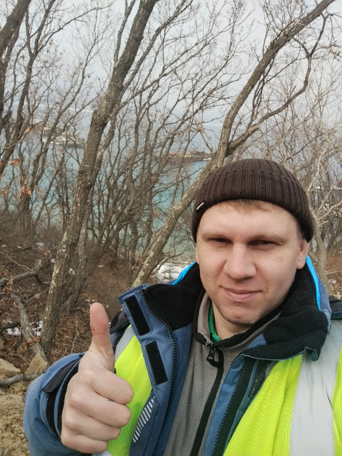 A man in a brown beanie and work jacket gives a thumbs-up against a backdrop of bare trees and a body of water with barges. The man's jacket is a combination of blue, black, and neon yellow. Some snow is visible on the ground near the bottom of the frame. The sky is overcast. The man appears to be smiling.
