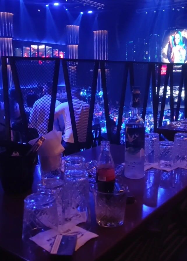 A night club scene is shown. The video is taken from behind a table with used glasses, a bottle of Grey Goose vodka, and a small Coca-Cola bottle. In the background, there are people seated at tables, with a metal grid separating the view from the main dance floor. The club is lit with blue stage lighting, and a large screen displays an image of a person. The music is loud.