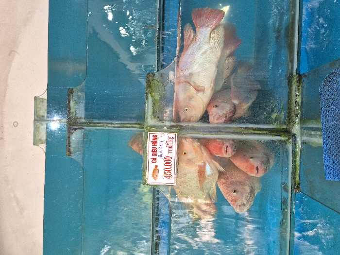 Fish swim in a clear, blue water-filled tank. They are red tilapia and are being sold for 450,000 VND/kg, as indicated by a price tag stuck to the side of the tank. The tank appears to be made of glass and has some algae growth along the seams. A blue cleaning pad is visible inside the tank.