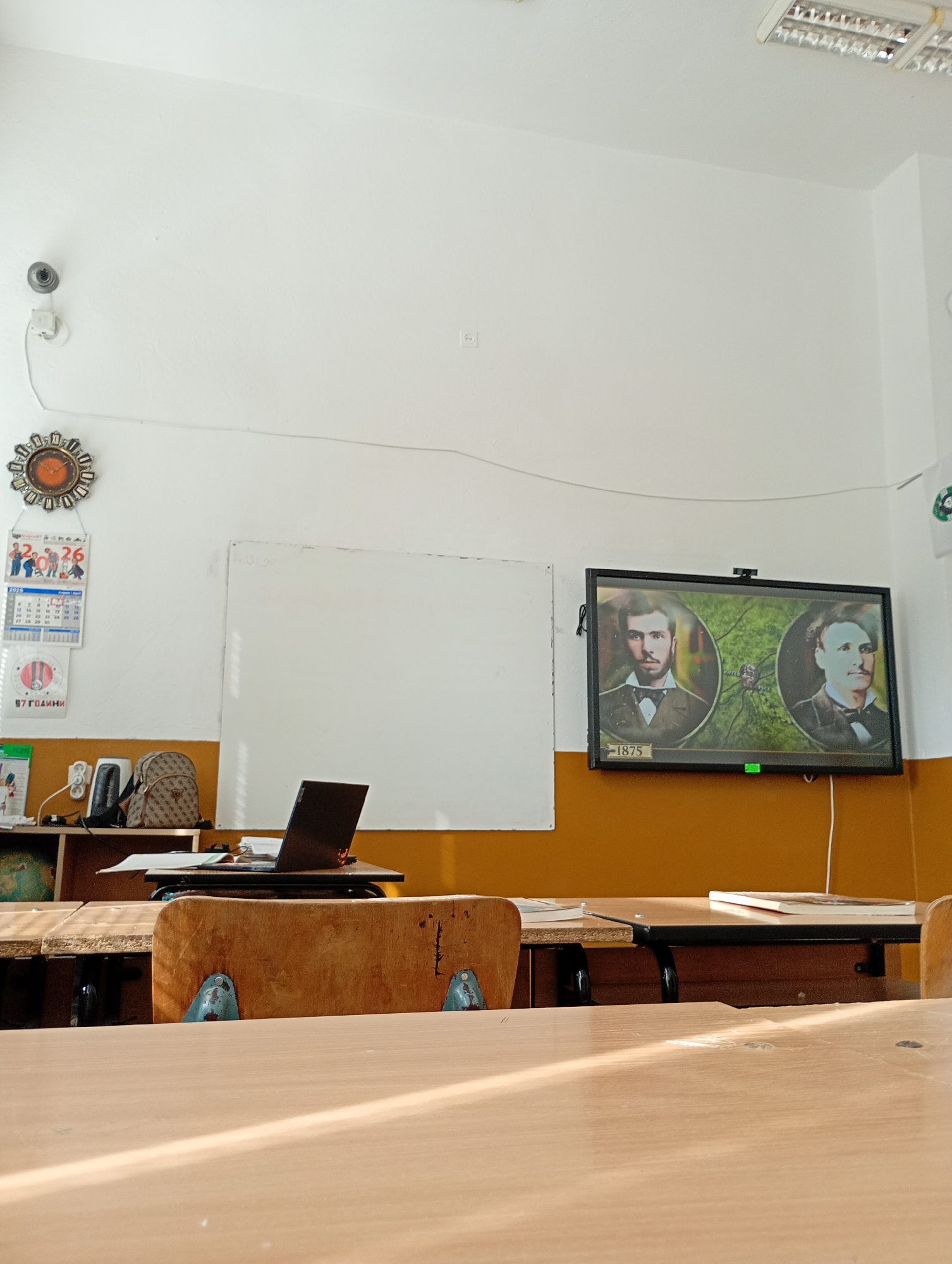 The photograph captures the interior of a classroom, likely in a school setting. The perspective is from a low angle, suggesting the viewer is sitting at a student desk. In the foreground, there is a light-colored wooden desk, partially illuminated by sunlight. A row of classroom desks and chairs is visible behind the foreground desk. In the background, there is a white whiteboard and a flat-screen television mounted on the wall. The television screen displays what appears to be a presentation or historical images of people, specifically two portraits within circular frames. Above the whiteboard, the walls are painted white. Below the whiteboard, the wall is painted with an orange-yellow color. A clock and a calendar are visible on the wall beside the whiteboard. A laptop is visible on a desk in the background. There is no immediate indication of the city of Zlataritsa, Bulgaria, in the visual information provided, although it can be deduced as the location based on external knowledge.