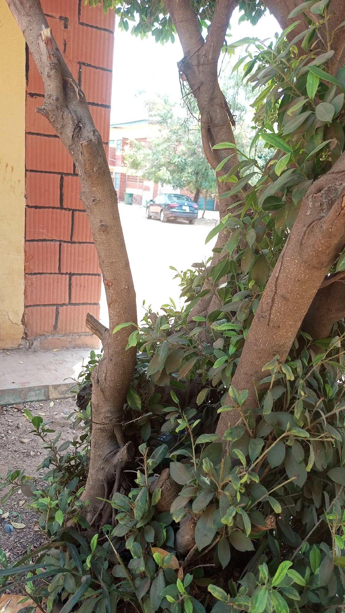 The image depicts an outdoor scene on a bright day in Abuja, Nigeria, viewed from behind a cluster of trees. In the immediate foreground, multiple tree trunks with brown bark rise vertically, surrounded by dense green foliage, some of which appears dusty. The ground level beneath the trees consists of dirt and scattered debris. To the left of the central trees, a building wall is visible. The lower section of the wall is light yellow and appears weathered, transitioning to a reddish-brown brick section with vertical corrugated ridges and dark mortar lines. A concrete curb separates the wall from the ground. Beyond the trees and to the right, a light-colored paved street or driveway recedes into the background under bright, possibly sunny conditions. A dark-colored sedan, appearing blue or dark gray, is parked or traveling away from the viewer on the left side of this street, positioned in the mid-distance. Its rear is visible, and it appears to be a Volkswagen. Further in the background, partially obscured by other trees, a multi-story building with a reddish-brown roof and light-colored walls with green accents is discernible. A green cylindrical waste bin is also visible on the left side of the street in the distance. No individuals are present in the scene.