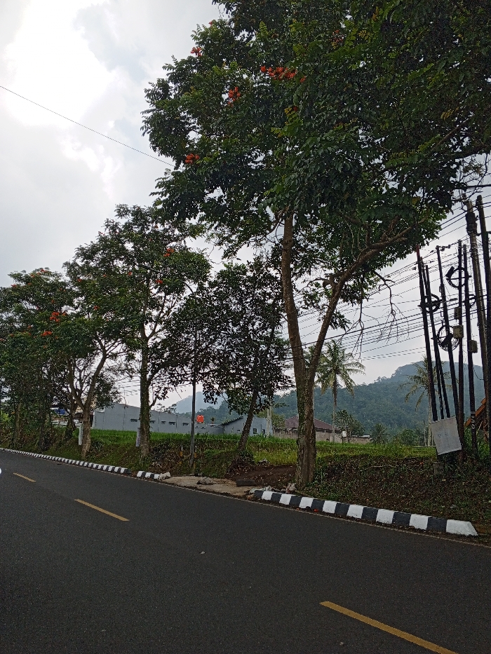 The image depicts a rural or semi-rural roadside scene, likely in a hilly or mountainous region