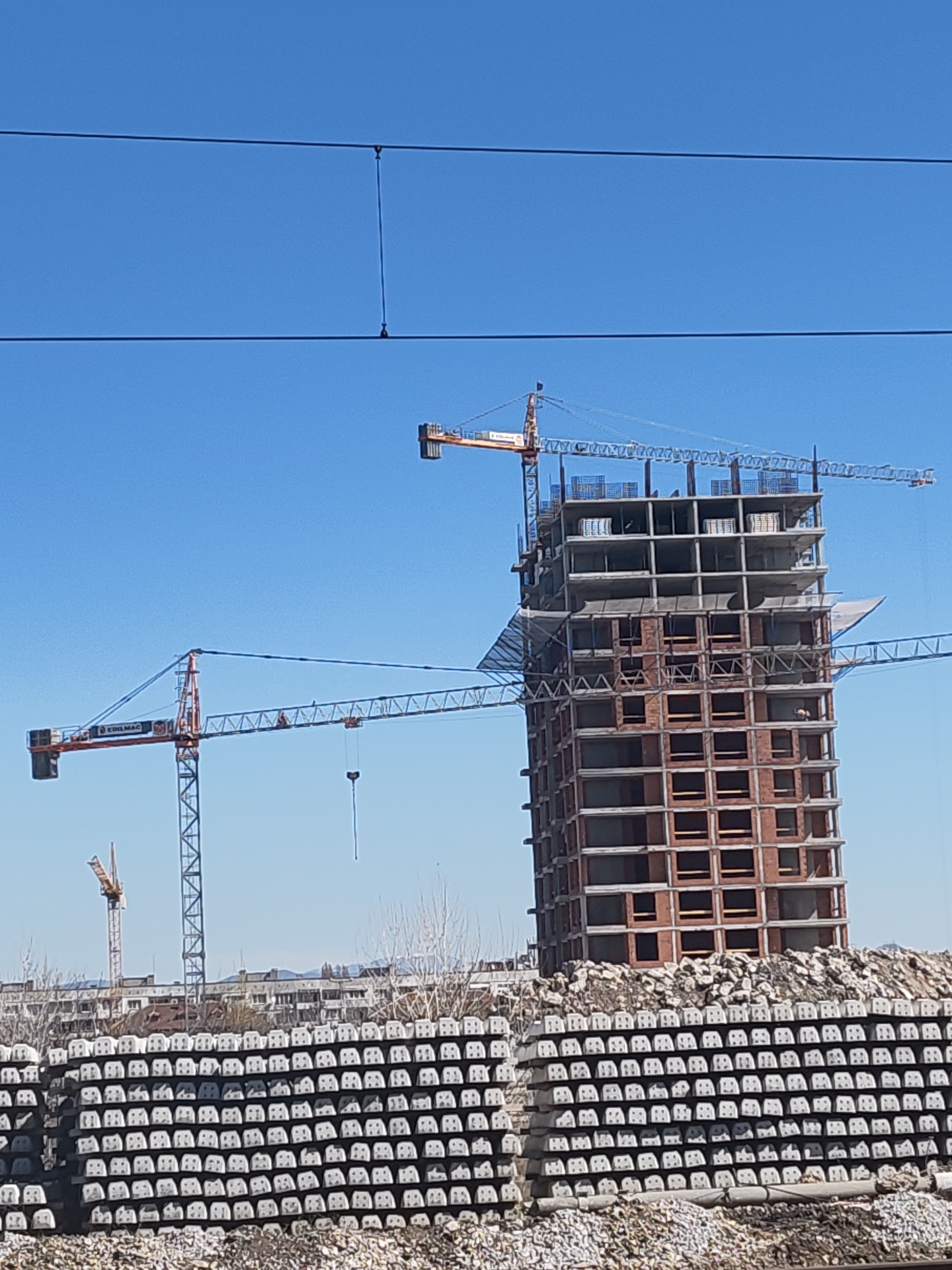 The image depicts a construction site in Sofia, Bulgaria. A tall, multi-story building is under construction, surrounded by several cranes. The building's structure is visible, with brickwork and concrete sections. In the foreground, there are stacks of gray concrete railway sleepers. Further in the background, buildings and infrastructure are visible. Overhead power lines run across the top of the frame. The sky is clear and blue.