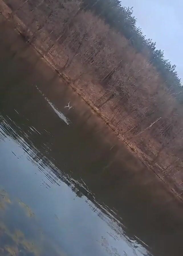 lake, likely a natural body of water given the surrounding landscape. The camera angle is tilted, creating a slightly skewed perspective of the scene. Along the right side of the frame is a dense forest of bare trees with a line of evergreen trees at the top of the embankment. The water is calm, with some visible ripples and reflections on the surface. Some algae or aquatic plants are seen under the surface of the water in the foreground. The sky is visible at the top of the frame, appearing overcast or pale. The overall impression is a quiet, natural scene.