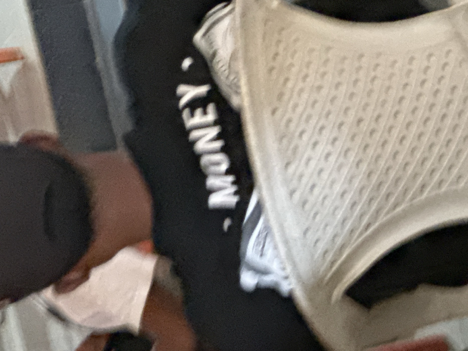 An overhead-angle image depicts the upper torso and head of an individual seated in Iriebe, Nigeria. The subject wears a dark cap and a black long-sleeved shirt with the word "MONEY" printed in white capital letters on the upper back, flanked by two small white circular marks. The individual's neck shows dark skin. Directly in front of the subject, partially obscuring the lower back, is the perforated backrest of a light-colored plastic chair. To the left, a portion of another person wearing a light-colored short-sleeved garment is visible. The background includes indistinct dark and orange surfaces. No specific actions or interactions are discernible, and the lighting suggests an indoor or evening setting.