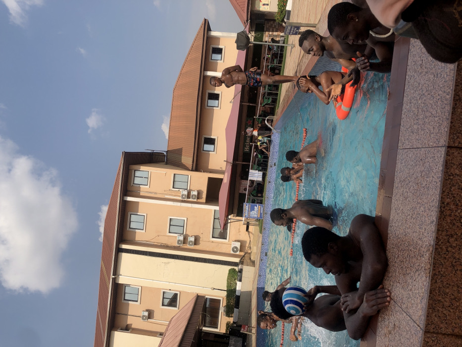 A group of men enjoy a summer day at a swimming pool alongside a multi-story building