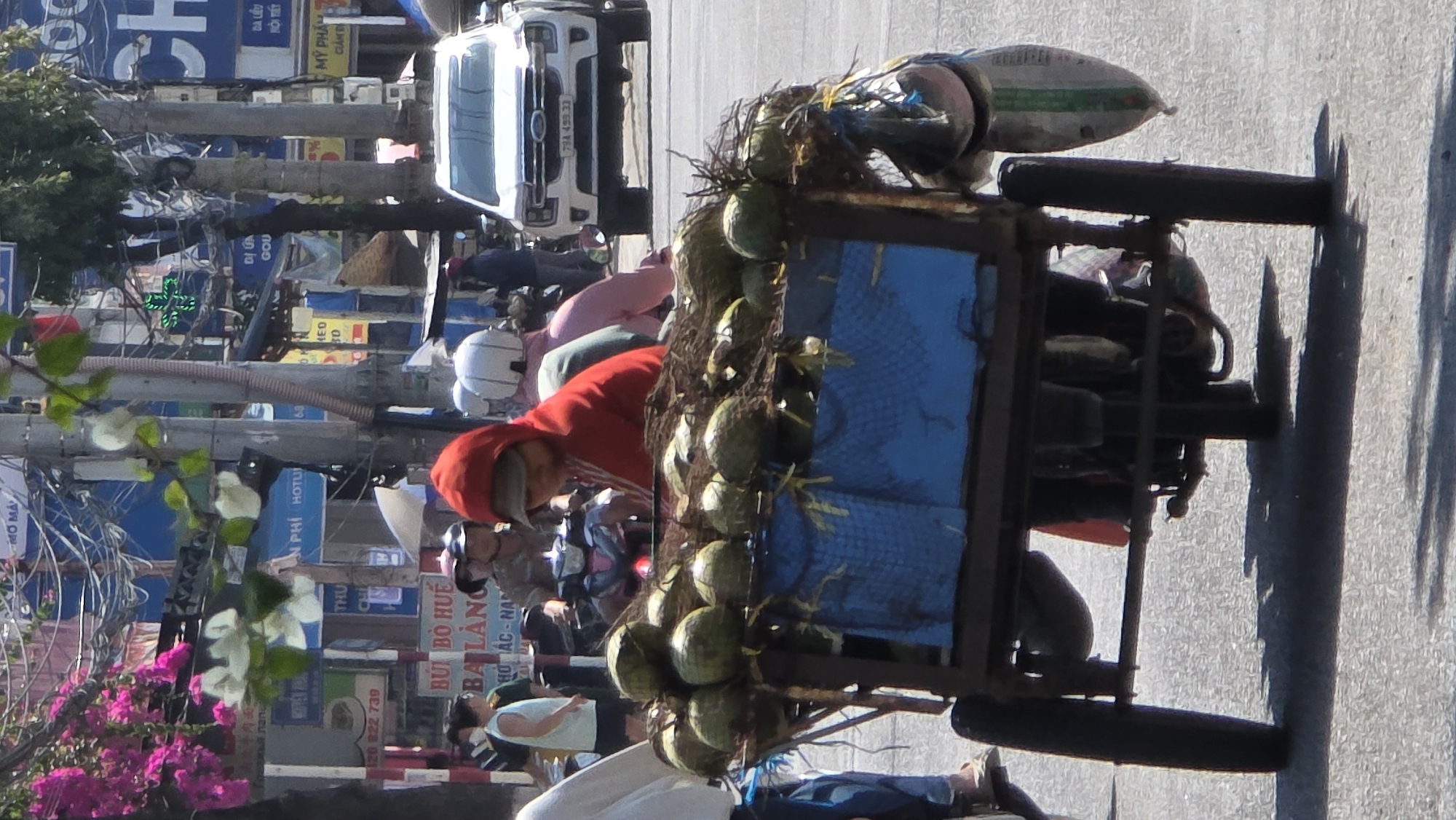 street scene in a busy urban area. A man in a red hoodie is next to a small cart loaded with what appears to be coconuts. The cart has a blue covering inside. Various signs and billboards are visible in the background, written in Vietnamese. There is a white vehicle with license plate 76A 499.33 parked on the side of the street. There are other people walking and riding scooters nearby. Flowers are in the foreground.
