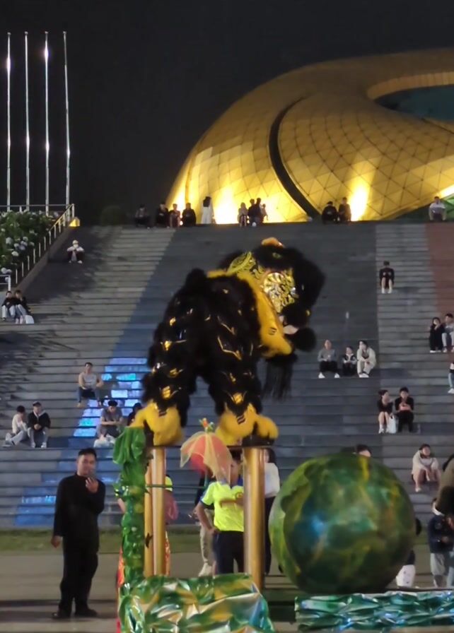 The video depicts a lion dance performance taking place at night in front of a grand building, possibly a theater or cultural center, which features a dome-shaped roof. The lion, black and yellow in color, is standing on elevated poles. Several people stand around the base of the poles, likely assisting with the performance. Behind the performance area, many people are seated on the steps leading up to the building, watching the show. Artificial green plants and large, round, green decorations are placed near the stage. There are flagpoles visible on the left.