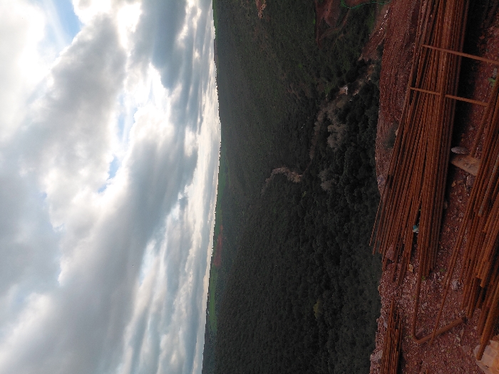 A cloudy sky looms over a landscape of dense, green forest. Adjacent to the forest, an area of reddish soil is visible. Rust-covered metal rods are stacked on the red soil. The image is taken from a high vantage point. The composition emphasizes the contrast between the natural elements and the man-made materials.