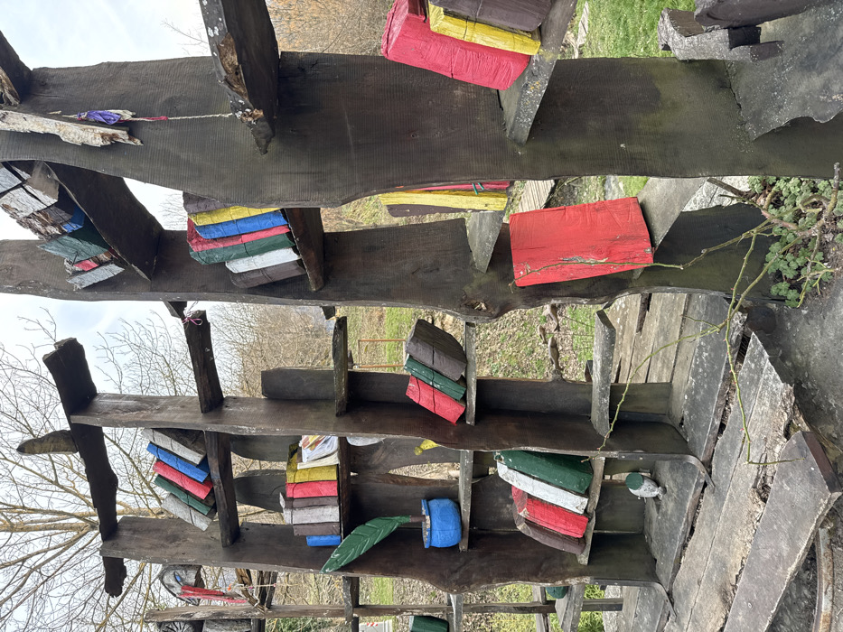 The image displays an outdoor art installation located in Veliko Tarnovo, Bulgaria. Two large, rustic wooden structures, resembling oversized, irregular bookshelves, stand prominently in the foreground and midground. These structures are constructed from thick, dark-stained wood, featuring multiple horizontal shelves with rough, organic edges. Arranged on the shelves are numerous carved wooden blocks, painted in various bright colors including red, green, blue, yellow, white, and brown, designed to simulate books. They are positioned in different orientations, some standing upright, others leaning against each other or the vertical supports. On the left structure's third shelf, a small blue pot holds a green, feather-shaped object, possibly a quill. At the base of the left structure, a small, white and green bird figurine is visible. The right structure has colorful fabric pieces tied near its upper sections. The ground beneath the structures is covered by weathered wooden planks, transitioning to dry grass and sparse vegetation, including some thorny branches. In the background, the landscape consists of bare deciduous trees, indicating a dormant season, and dry, brownish grass on a gently sloping terrain. A partial view of a small wooden bridge is discernible in the mid-distance on the right. The sky is overcast and light grey, providing diffused natural illumination to the scene. No individuals are present in the image.