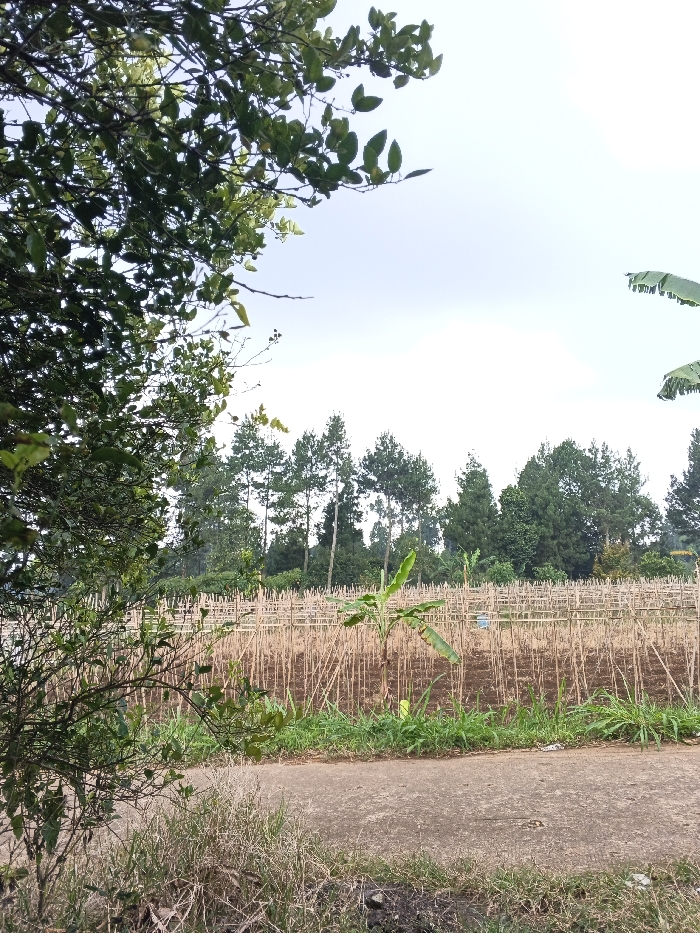 A rural scene showcases a field of tall, thin, brown stakes arranged in rows, possibly supporting crops. Lush green trees line the horizon, contrasting with the dry field. A small banana tree is centrally located. A road cuts through the foreground with overgrown grass and foliage. A tree with dense green leaves occupies the left side of the frame, partially obscuring the view. The sky is overcast, casting a soft light over the landscape.