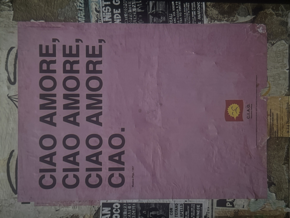 A pink, worn poster displays the words "CIAO AMORE" repeated three times, followed by "CIAO