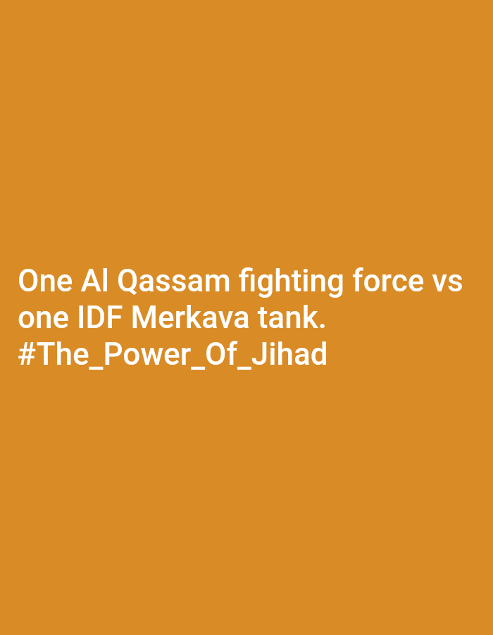 The image presents a solid orange background. Centered on this background, white text is displayed in four lines. The text reads: "One Al Qassam fighting force vs one IDF Merkava tank. #The_Power_Of_Jihad". No individuals, subjects, physical objects, specific actions, or interactions are visually depicted within the image. The image is purely textual content on a monochrome background and contains no discernible environmental features or location information, including any reference to the city of Ilie, Indonesia.