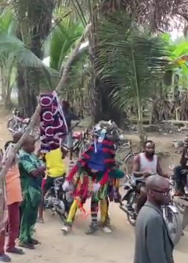 person dressed in a colorful costume and mask dancing among a crowd of people. The dancer wears a blue and red striped shirt, yellow leggings, and elaborate headdress decorated with what appear to be white balls. The crowd consists of people of different ages and genders, some dressed in casual wear like t-shirts and tank tops, and others in more formal attire like suits. Some individuals are standing by motorcycles, and a flag with circular patterns hangs from a tree branch. The setting seems to be an outdoor area with sandy ground, surrounded by palm trees and other tropical vegetation.