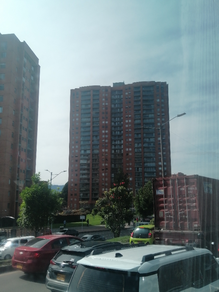 The image displays an urban street scene in Bogota, Colombia, specifically identifiable as the vicinity of Carrera 7 and Calle 94-96 within the Chicó neighborhood. Two tall, multi-story residential buildings constructed of reddish-brown brick material dominate the background. The building on the right is taller and more prominent, featuring multiple balconies across its facade. The sky is light and mostly overcast. In the foreground, a multi-lane roadway is visible with several vehicles. These include the roof and rear window of a white SUV in the immediate foreground, a dark gray SUV, and a red sedan in the left lanes. A bright lime green compact car is positioned on the right side of the road, appearing parked or stationary. A large, rusty red shipping container is partially visible on the far right, displaying markings "ECMC" and "3074696 42G1." A street light with a horizontal arm and lamp extends into the frame from the right. Between the road and the buildings, a green, landscaped median or park area contains several trees and bushes, some with red flowers. Multiple indistinct human figures are visible walking or standing within this green space in the middle distance. The overall scene suggests daytime, possibly captured from inside a vehicle due to slight reflections and vertical lines visible on the right side of the image.
