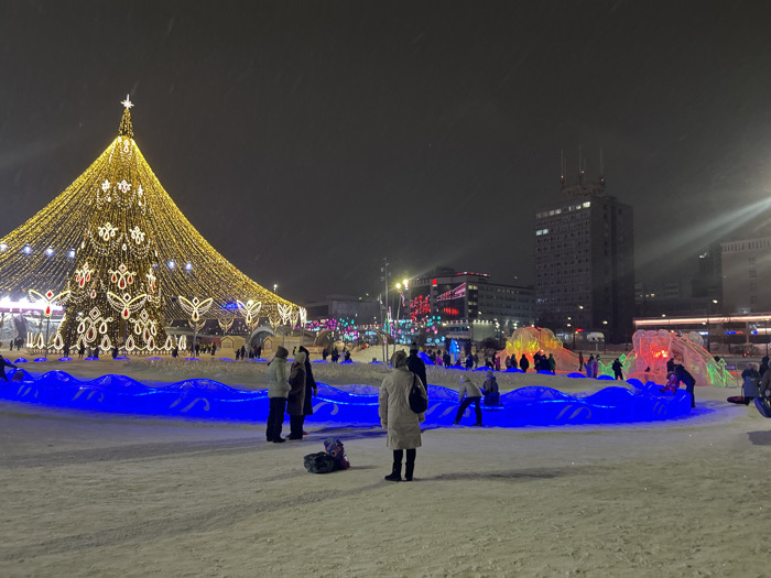 A large Christmas tree adorned with lights dominates the frame on the left side of the image. In the foreground, blue-lit ice sculptures attract people of all ages. A tall, slender building looms in the background, contrasting with the festive scene. The entire area is covered in snow, enhancing the winter ambiance. Several people are standing around the sculptures, some watching children playing in the illuminated ice.