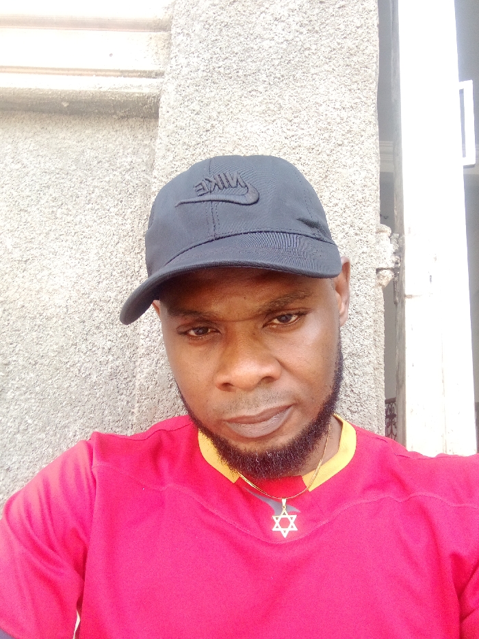A single adult male is depicted in a head and torso shot against a textured wall in Orlu, Nigeria