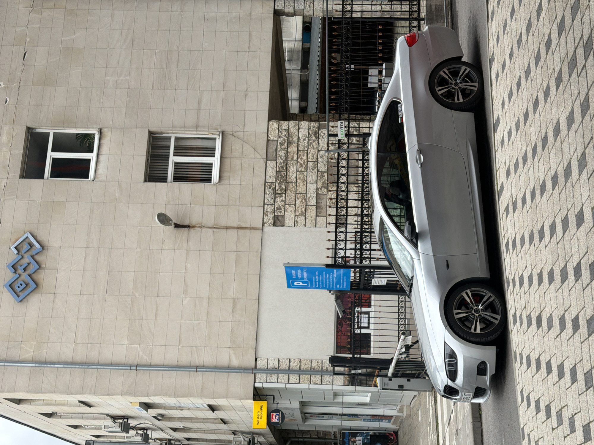 The scene depicts an urban street in Plovdiv, Bulgaria. A silver two-door BMW 3-series coupe (E92 generation) is parked parallel to the curb on a dark asphalt road. The vehicle features black multi-spoke alloy wheels with red brake calipers and blacked-out headlight bezels. The front license plate displays "Р 7678 XT". A sticker on the rear passenger window shows the Bulgarian flag and the Cyrillic text "И. МЕЧКОВ". Adjacent to the street, a sidewalk is paved with light and dark gray interlocking pavers arranged in a checkerboard pattern. To the left, a multi-story building with a light beige tiled facade is present. A blue, angular, three-character logo, resembling "ВТЛ", is affixed to the upper facade. The building features multiple white-framed windows; one upper window shows a green plant inside, while a lower window has visible vertical blinds. Air conditioning units are mounted on the building's left side, and a metal downspout runs vertically. A yellow cantilevered sign displaying "Western Union WU" and "Easy Pay" logos is visible on the lower left portion of the building, above an entrance. In the mid-ground, a black wrought-iron fence with decorative elements encloses an area, likely a parking entrance. A white automated parking barrier is visible behind the fence. A blue rectangular sign, containing the Cyrillic text "ПАРКИНГ 'МЕЧКОВ' ЕООД" and "Пловдив", along with parking regulations, is affixed to a pole. A surveillance camera is mounted on this pole, directed towards the fenced entrance. An older model street light fixture with an exposed bulb is attached to the building facade between the upper and lower windows. No individuals are present or engaged in any discernible action within the frame.