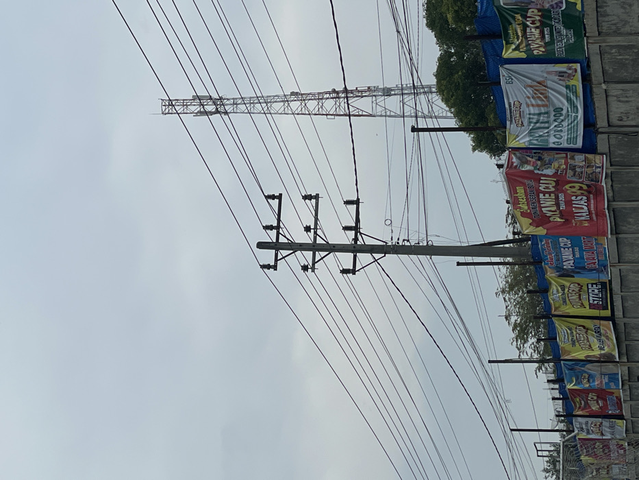 The image captures an outdoor scene in Alue Mangki, Indonesia, under an overcast sky. A prominent gray concrete utility pole, equipped with three sets of dark cross arms and multiple black electrical power lines, stands in the left-center of the frame, with lines extending horizontally and diagonally. To the right, a tall, slender metal lattice telecommunications tower is visible, partially obscured by a distant tree line and overhead wires. In the foreground, a concrete perimeter wall runs horizontally across the lower section of the image. Approximately nine colorful fabric banners, advertising local events and businesses, are affixed to the top of this wall. Visible text on these banners includes "PAYANIE CUP," "TURNAMEN SEPAK BOLA" (football tournament), "KAJAS 99," "CAHAYA MART," and "BERSAMA CARTA LIAR," suggesting event sponsorships. Behind the wall and banners, a blue netting or tarpaulin is visible, along with green foliage from trees. A white structure, consistent with a sports goalpost, is partially visible on the far left. No individuals are present within the frame.