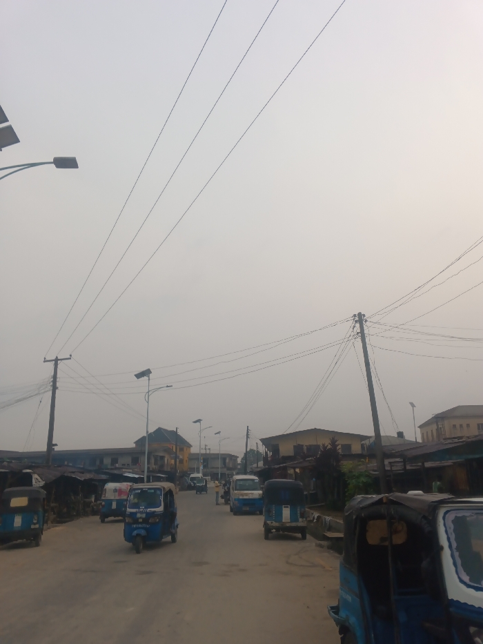 An overcast day captures a street in what appears to be a developing country. The road is lined with makeshift shops, homes, and businesses. Several blue auto-rickshaws, commonly known as "Keke Napep" in Nigeria, are visible, indicating a mode of transportation. Utility poles with numerous electrical wires crisscross overhead. Streetlights are spaced along the road, illuminating the gray atmosphere. The air seems hazy, adding to the muted color palette of the scene.
