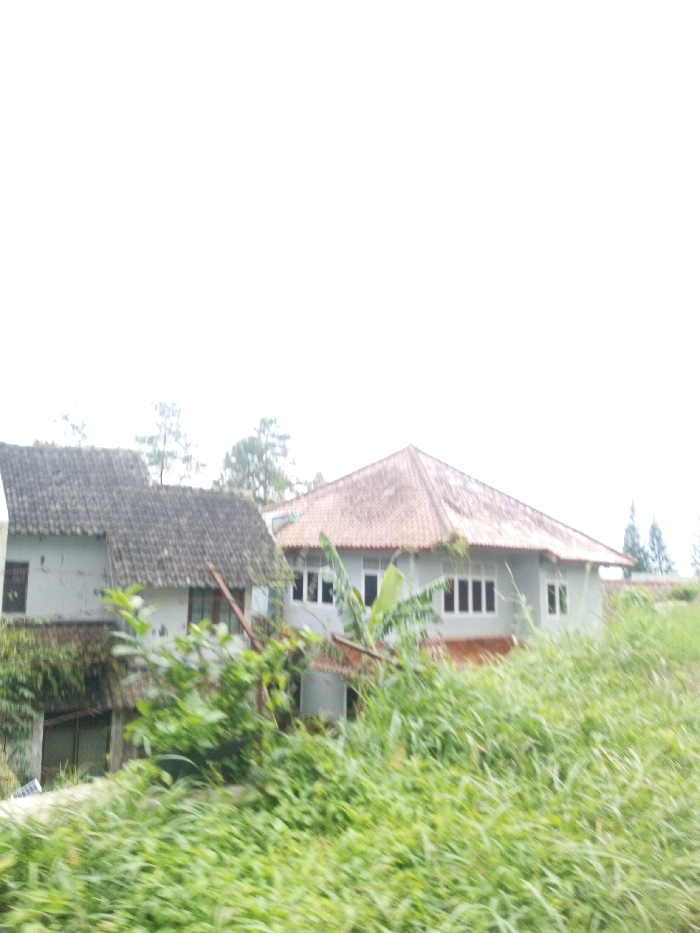 The image displays a landscape in Bagochen Boolingpang Ueling, Bhutan, featuring two residential buildings and dense vegetation. The upper portion of the frame is dominated by an overexposed, bright white sky. On the left, a two-story structure with light-colored walls and a dark, weathered tiled gable roof is partially obscured by green foliage. One dark rectangular window is visible on its upper left, and a partially obscured brown-framed window is on the lower right. To the right, a larger, two-story house with a light grey exterior and a terracotta-colored hip roof with visible tiles is present. This house features multiple rectangular windows with white frames across its front facade. A large green broad-leafed plant, possibly a banana plant, is situated between the two buildings and in front of the right structure. The foreground is filled with a dense mass of out-of-focus green grasses. Behind the buildings, scattered trees with green foliage are visible. No individuals, discernible actions, or specific objects beyond the buildings and vegetation are present.