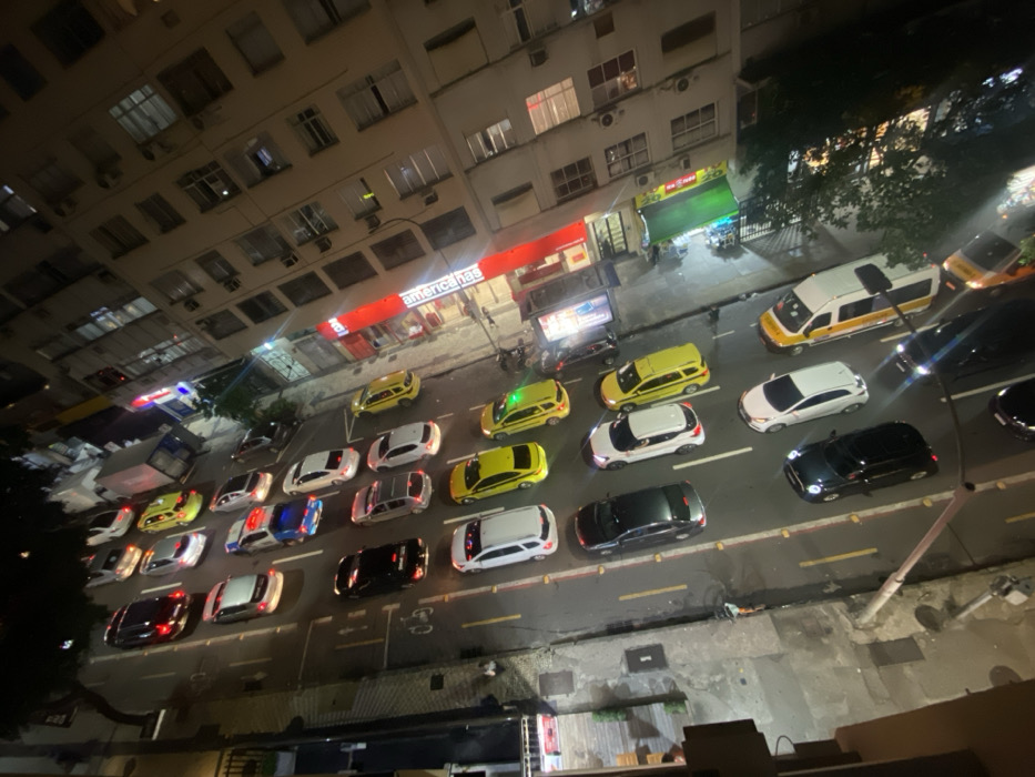 An aerial view reveals a street lined with parked cars, primarily yellow and white, reflecting ambient light. Buildings flank the street, one prominently displaying "Americanas" in red. A white van and a police car are also visible. The scene is captured at night, with streetlights and building windows illuminating the area. Shadows from the buildings and objects on the street add depth to the image.