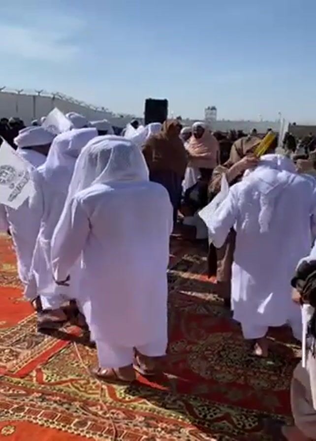 A group of people, predominantly men, are gathered outdoors. Many are wearing white clothing and head coverings, some carrying flags. They are standing on a patterned carpet, with a speaker and other individuals in the background. A chain link fence is visible in the distance.