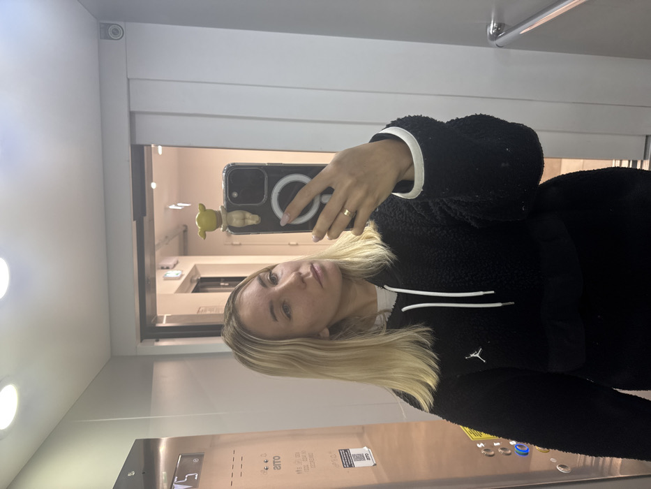 A blonde female, appearing to be a young adult, is depicted taking a mirror selfie in what appears to be an elevator or a reflective hallway. She wears a black, textured, hooded sweatshirt with white drawstrings and a white Jumpman logo on the left chest, over a white undershirt. A plain gold-toned ring is visible on her right ring finger. She holds a dark-colored smartphone with a clear case, featuring a MagSafe ring and a small yellow Baby Yoda figurine attached to the top rear. Her expression is neutral, directed towards the phone/mirror. The background, reflected in the mirror, reveals a modern indoor environment. To the left, a brushed metal elevator control panel displays an illuminated "5", the text "OTIS" and "otto", and a QR code. Unlit circular buttons are also present on the panel. Through an open doorway behind the subject, a brightly lit hallway with light-colored walls and a light-colored floor is visible. To the right, a white panel and a partial silver horizontal handrail are present. Recessed circular lighting fixtures are visible on the ceiling. While the environment is consistent with modern buildings in Warsaw, Poland, a specific address or identifiable landmark within the city is not discernible from the image.