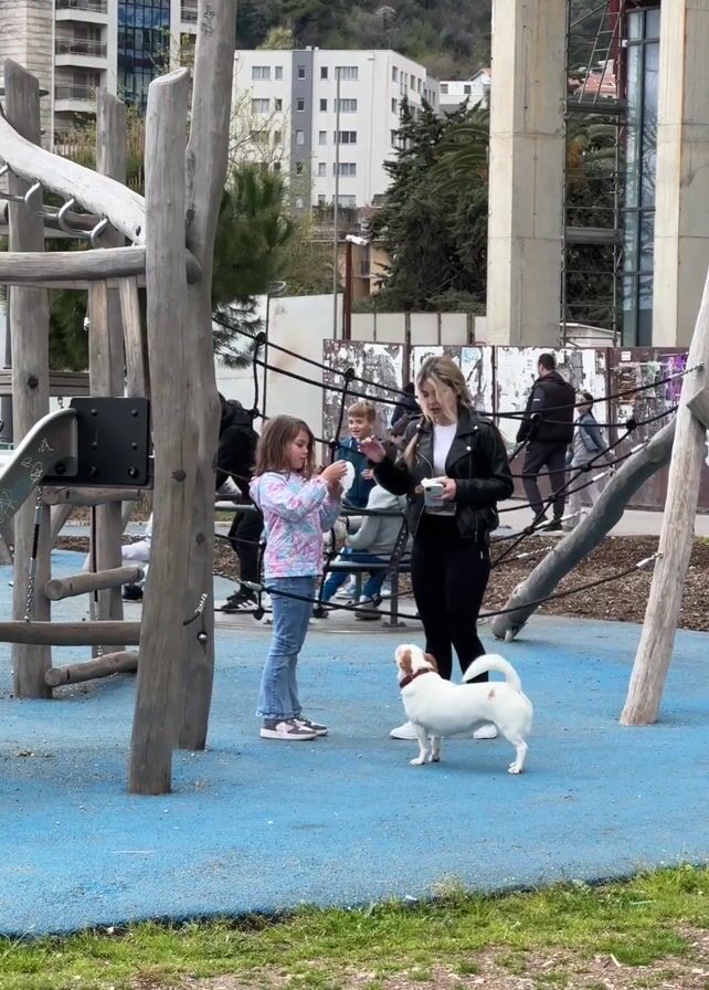 two girls and a small dog in a playground. The playground has wooden climbing structures on a blue rubber surface. The younger girl is holding up a piece of paper, while the older girl in a black leather jacket looks down at a white and tan dog standing in front of her. The older girl also appears to be holding papers. In the background, there are other people, including a group of children sitting at a table and a man walking away from the camera. Tall buildings and a hillside are visible in the distance.