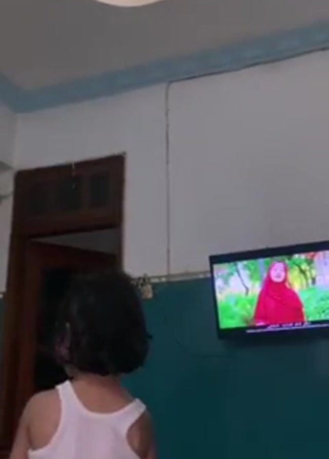 A little girl with short, dark curly hair is standing in front of a television in an indoor setting. She wears a white tank top and turns to look at the camera briefly before turning back to face the TV. The television screen displays a woman wearing a red hijab. The room has white walls with a blue-green lower section, and a dark wooden doorframe is visible on the left side of the frame. There is a skylight in the ceiling. The lighting appears to be a combination of natural light from the skylight and artificial light. The girl is watching the television, which seems to be playing a music video.