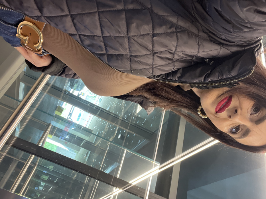 A woman with long, dark hair, red lipstick, and pearl hoop earrings is depicted in a selfie, looking directly into the camera with a slight smile. She is wearing a black quilted puffer jacket, partially unzipped, over a beige ribbed top. Her lower attire consists of blue denim jeans and a brown belt featuring a large gold "G" buckle. Her left hand is positioned near the buckle. The background shows a modern interior with large glass windows that reflect linear light fixtures and structural elements from within the building. Through the glass, an exterior scene includes what appears to be a parking lot or street with parked vehicles, specifically a dark-colored car and a white car, along with some indistinct greenery. A silver-colored metal handrail is visible in the lower right portion of the frame, suggesting a staircase or escalator. The scene is located within a building in Mensdorf, Luxembourg.