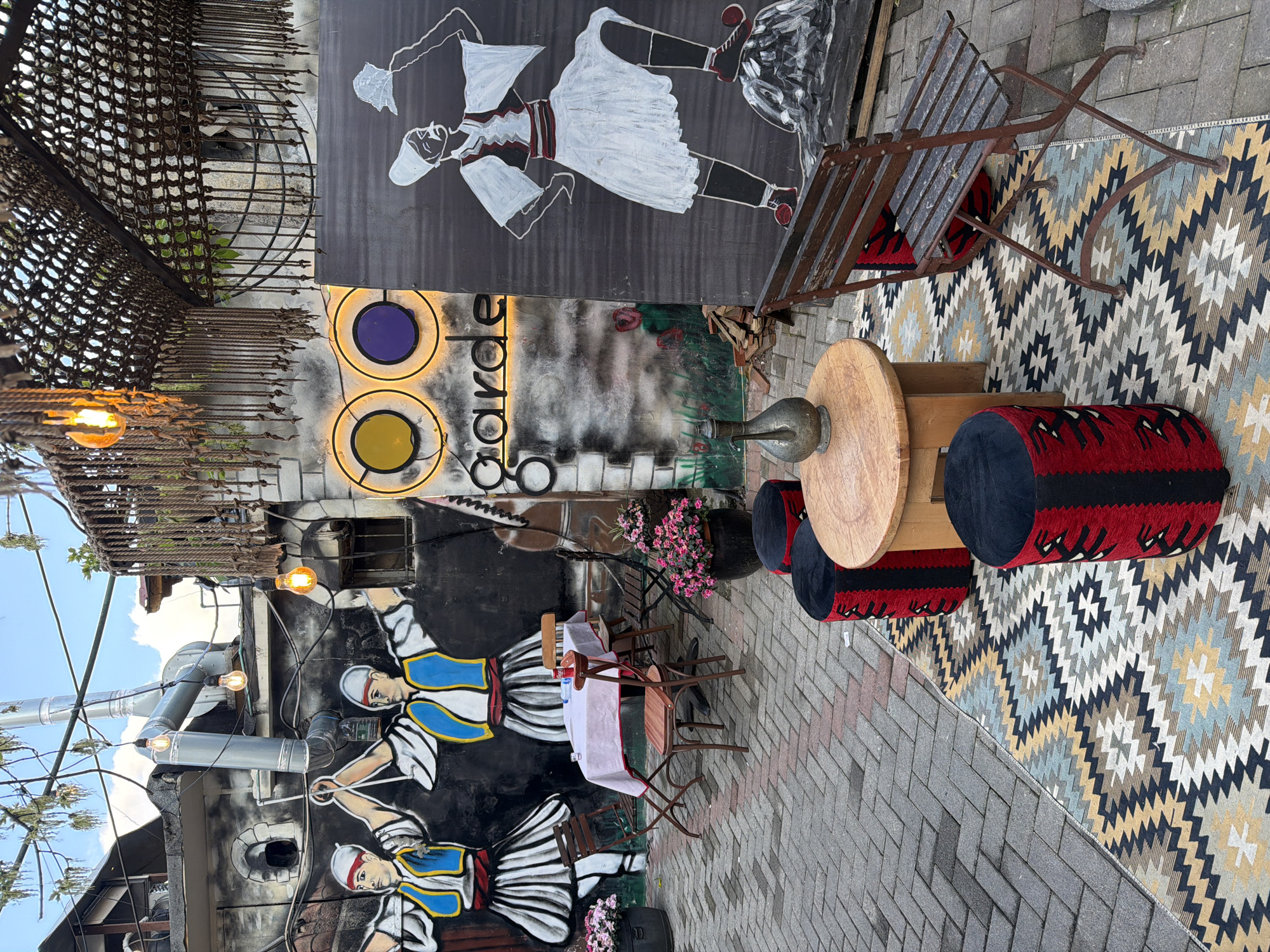 The image depicts an outdoor café setting in Tirana, Albania. The scene is set against a backdrop of buildings adorned with murals of Albanian figures in traditional dress, with one mural depicting a dancer and another showing two men with rifles. The buildings feature decorative elements such as caged metal structures and exposed light bulbs. The café area includes a wooden table with an urn-like centerpiece, surrounded by chairs and upholstered stools resting on a rug with a geometric pattern. Another table is set with a white tablecloth and place settings. The paving is comprised of grey rectangular bricks. The sky is visible above the buildings, suggesting daytime. The name "Garde" is painted on the wall.