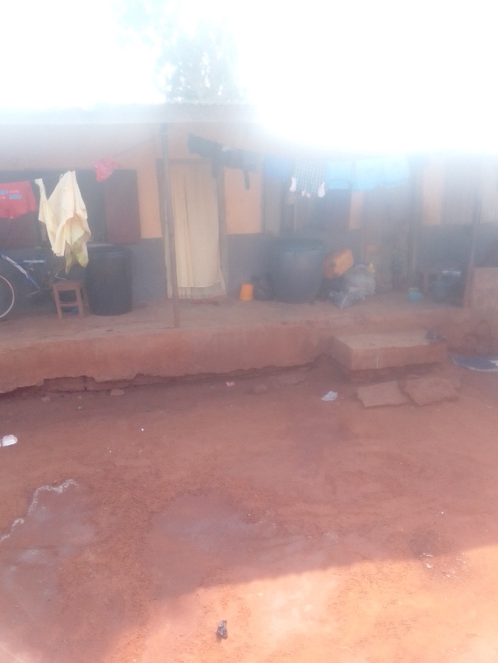 The image captures the exterior of a single-story building in the city of Unknown, Unknown, under bright, possibly diffused lighting. The foreground consists of reddish-brown earth, showing areas of lighter-colored residue and scattered white debris. The building features a raised, unpainted concrete or earthen porch that runs across its front, approximately 30-40 centimeters in height. Access to the porch is facilitated by a set of irregular steps composed of concrete blocks on the right side. The building itself has walls painted in a light brown or orange hue and is topped with a corrugated metal roof. Sparse tree foliage is discernible above the roofline. Various objects are arranged on the porch and immediately in front of the structure. From left to right: a partial view of a blue bicycle; multiple articles of clothing, including a yellow garment and a red T-shirt, hanging on lines or frames; a dark, cylindrical barrel positioned next to a small wooden stool; a cream-colored curtain hanging within an opening; a second large, dark barrel; a yellow bucket on the ground near the second barrel, accompanied by a clear plastic bag containing assorted items and a yellow jerrycan. No individuals are present in the scene.