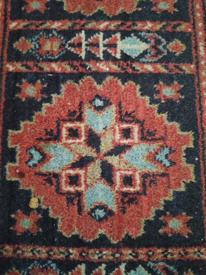 An up-close view of a carpet reveals a complex geometric pattern. A central, floral medallion in red and light blue is surrounded by a dark blue field dotted with smaller floral motifs. A patterned border with repeating geometric shapes frames the main design. The carpet's texture is visibly coarse, and the colors appear somewhat faded, suggesting age or wear.